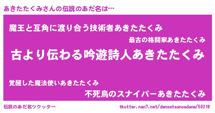 | ヒーロー風カッコイイあだ名 | 『ネオアキタタクミ』『仮面アキダー』 |