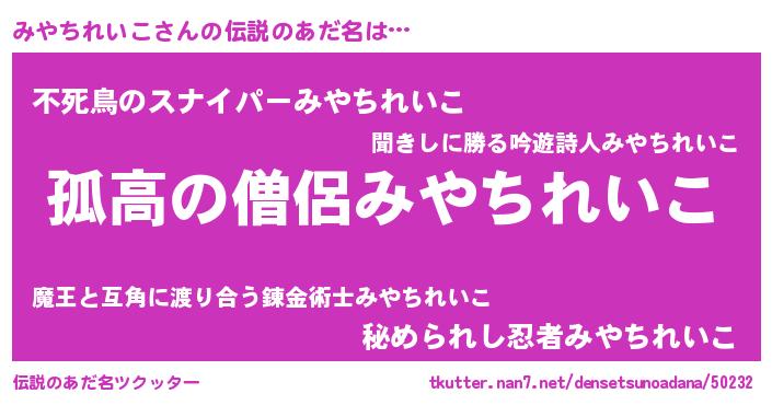 | 男性向けラノベタイトル風あだ名 | 『ダンジョンにみやちれいこを求めるのは間違っているだろうか』 |