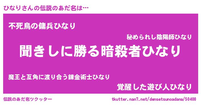| 女子向けラノベタイトル風あだ名 | 『異世界で失敗しない100のひなり』 |