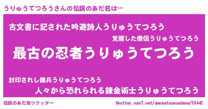 | 男性向けラノベタイトル風あだ名 | 『魔弾の王とうりゅうてつろう』 |