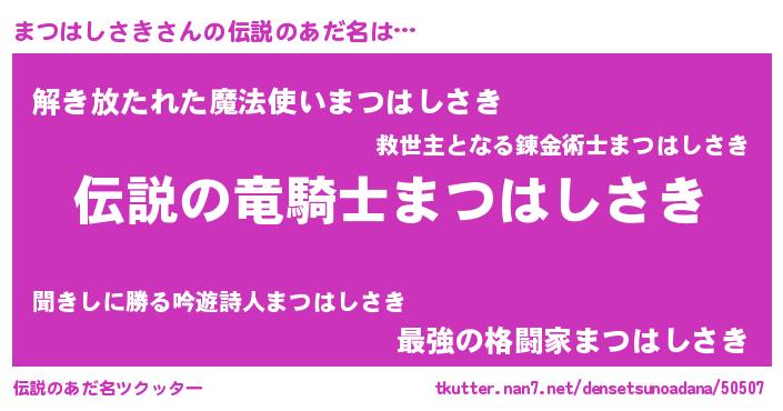 | ヒーロー風カッコイイあだ名 | 『スーパーマツハシサキ』『天弓騎士マツ』 |