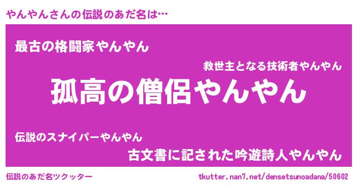 | 男性向けラノベタイトル風あだ名 | 『ダンジョンにやんやんを求めるのは間違っているだろうか』 |