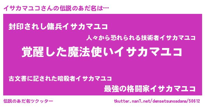 | 恥ずかしいあだ名 | 『イサカマユコデラックス』『イサっちょ』 |
