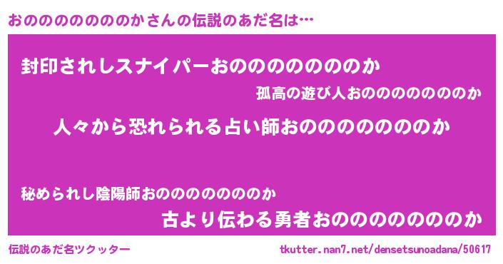 | 男性向けラノベタイトル風あだ名 | 『魔弾の王とおのののののののか』 |