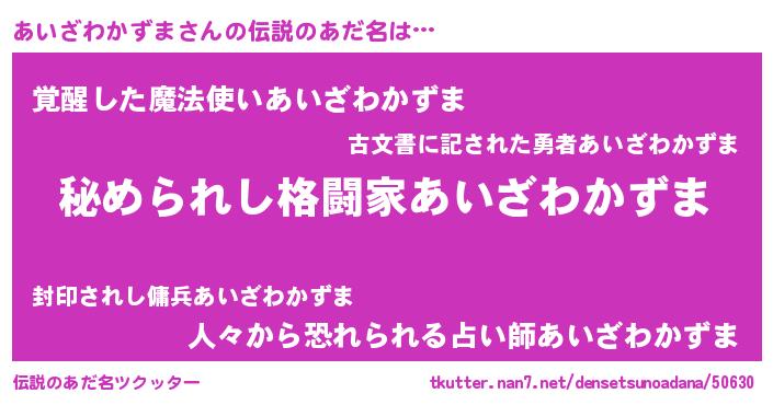 | 女子向けラノベタイトル風あだ名 | 『あいざわかずまが死なない童話 林檎のあいざわかずまの診療簿』 |