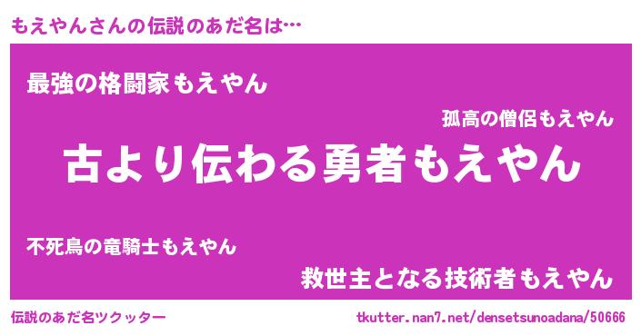 | 男性向けラノベタイトル風あだ名 | 『もえやんに滅ぼされるだけの簡単なお仕事です』 |