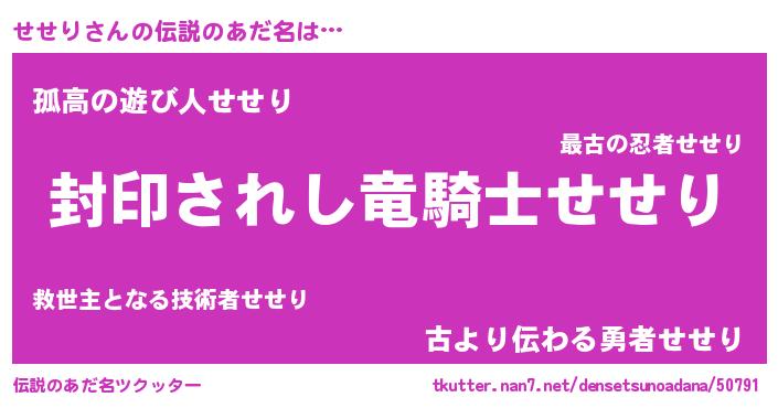 | 意味不明あだ名 | 『ペロリンせせり』『自称せせり』 |