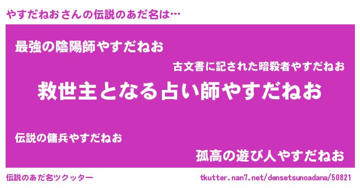 | 男性向けラノベタイトル風あだ名 | 『ノーゲーム・ノーヤスダネオ』 |