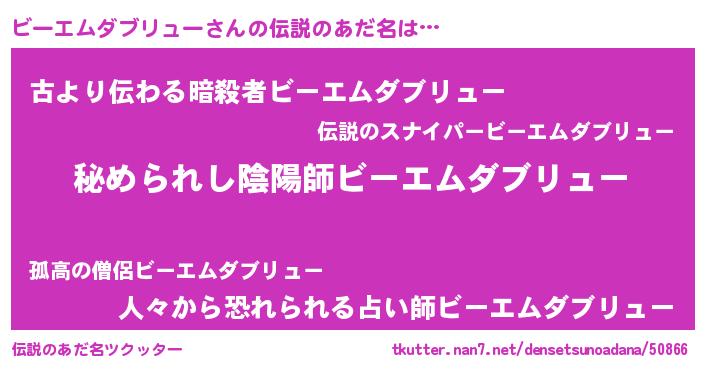 | 男性向けラノベタイトル風あだ名 | 『魔弾の王とビーエムダブリュー』 |