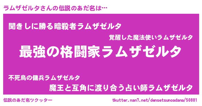 | 意味不明あだ名 | 『住所不定無職ラムザゼルタ(8歳)』 |