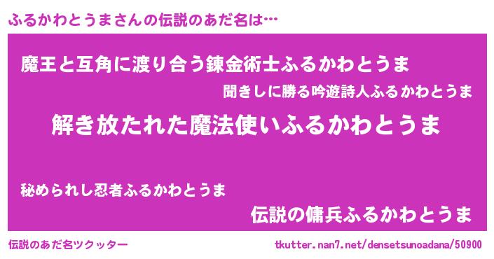 | 男性向けラノベタイトル風あだ名 | 『冴えないふるかわとうまの育てかた』 |