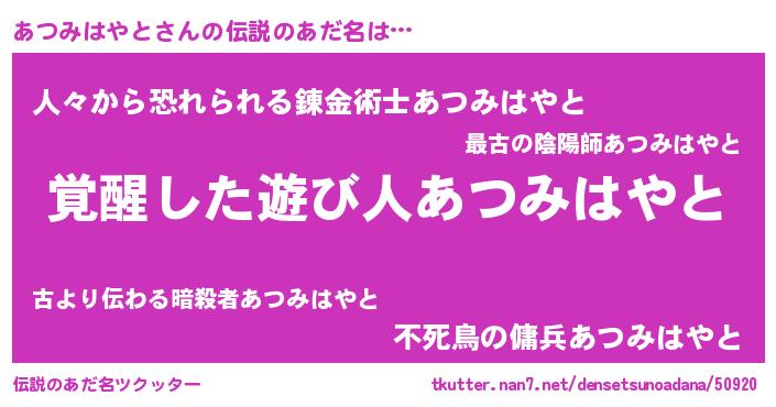 | 意味不明あだ名 | 『とにかく怪しいあつみはやと』 |
