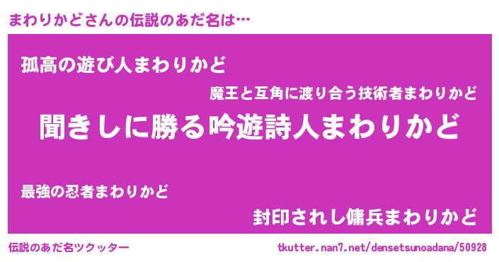| 男性向けラノベタイトル風あだ名 | 『まわりかどという概念が存在しない退屈な世界 』 |
