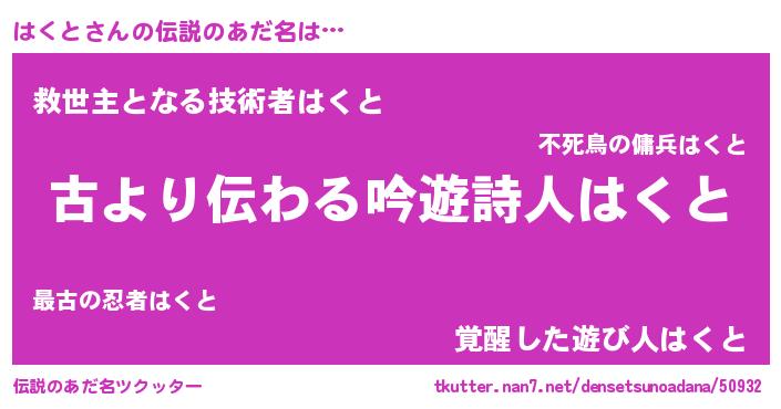 | 意味不明あだ名 | 『住所不定無職はくと(10歳)』『自称はくと』 |