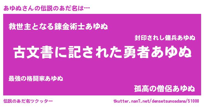 | ヒーロー風カッコイイあだ名 | 『ネオアユヌ』『天空の使者あゆぬ』 |