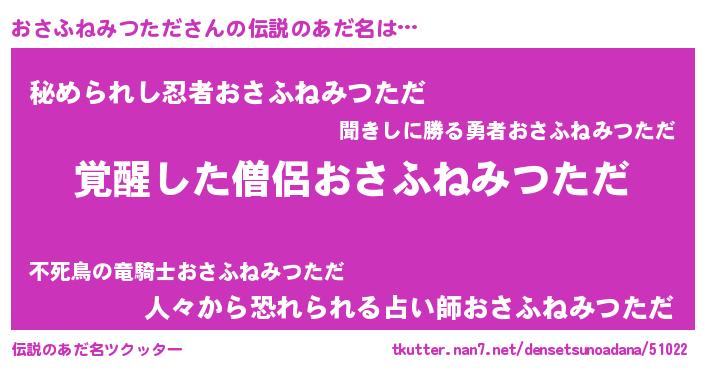 | 男性向けラノベタイトル風あだ名 | 『おさふねみつただに滅ぼされるだけの簡単なお仕事です』 |