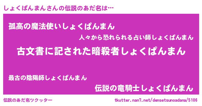 | 男性向けラノベタイトル風あだ名 | 『しょくぱんまん~年齢イコール彼女いない歴の魔法使い~』 |