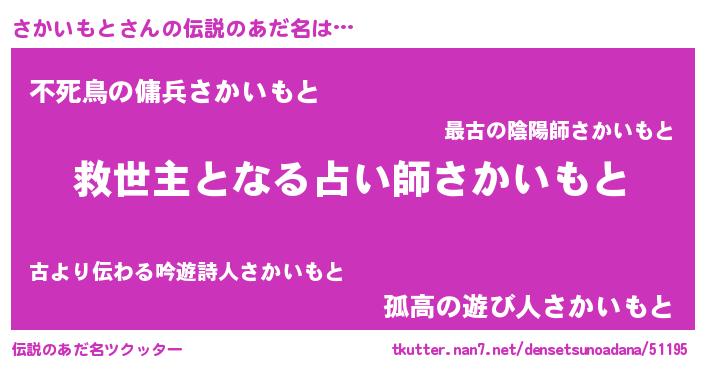 | ヒーロー風カッコイイあだ名 | 『慈愛の使者さかいもと』『炎刃騎士サカ』 |