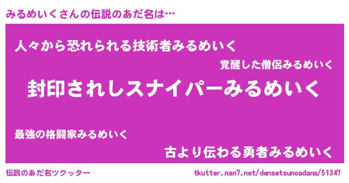 | 男性向けラノベタイトル風あだ名 | 『みるめいく~年齢イコール彼女いない歴の魔法使い~』 |