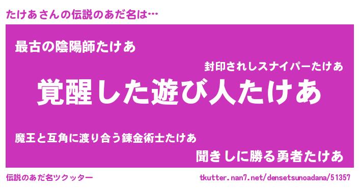 | 意味不明あだ名 | 『とにかく怪しいたけあ』『自称たけあ』 |