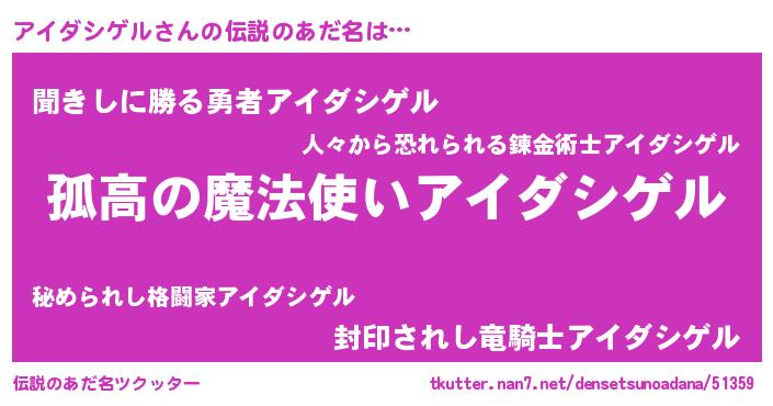 | 胡散臭い通販商品みたいなあだ名 | 『信頼と実績のサプリメント…その名も「アイダシゲル」』 |