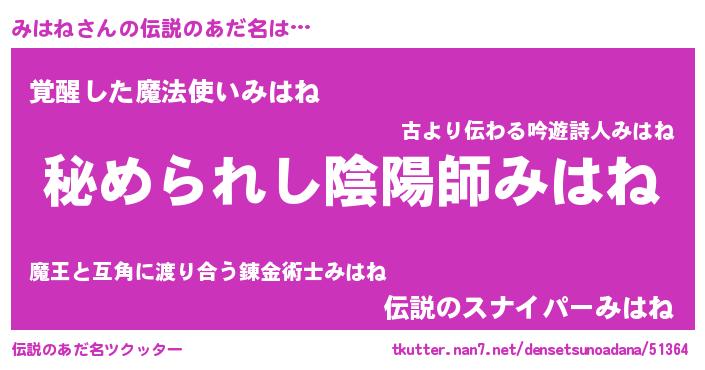 | 意味不明あだ名 | 『めかぶ科みはね属』『自称みはね』 |