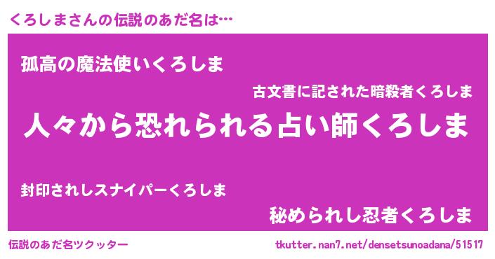 | 意味不明あだ名 | 『自称くろしま』『ニラ科くろしま属』 |