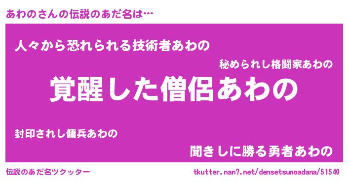 | ヒーロー風カッコイイあだ名 | 『天弓騎士アワ』『正義の使者あわの』 |