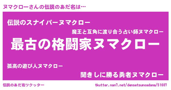 | ファンタジー風あだ名 | 『エターナルヌマクローー』『ゼヌマトゥ』 |