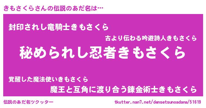 | 男性向けラノベタイトル風あだ名 | 『魔弾の王ときもさくら』 |