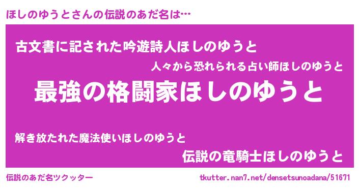 | 男性向けラノベタイトル風あだ名 | 『ほしのゆうとに滅ぼされるだけの簡単なお仕事です』 |