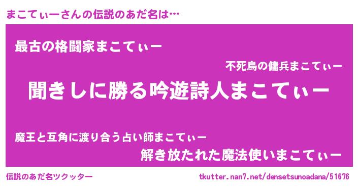 | 男性向けラノベタイトル風あだ名 | 『魔弾の王とまこてぃー』 |