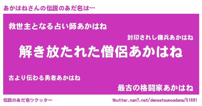 | 意味不明あだ名 | 『とにかく怪しいあかはね』 |