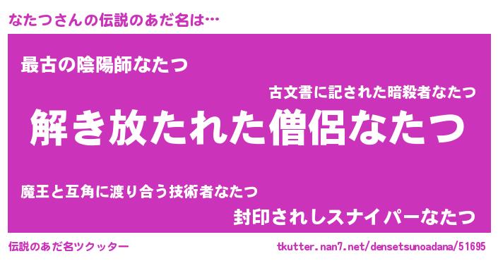 | 意味不明あだ名 | 『とにかく怪しいなたつ』『自称なたつ』 |
