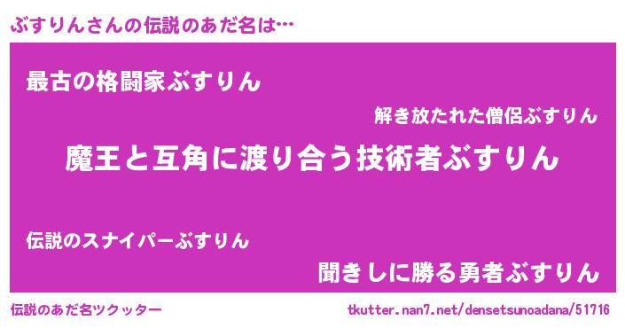 | 男性向けラノベタイトル風あだ名 | 『おまえをオタクにしてやるから、俺をぶすりんにしてくれ! 』 |
