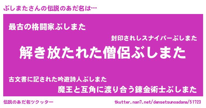 | 男性向けラノベタイトル風あだ名 | 『転生したらぶしまただった件』 |