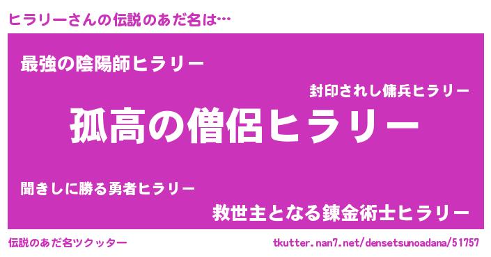 | 男性向けラノベタイトル風あだ名 | 『ダンジョンにヒラリーを求めるのは間違っているだろうか』 |