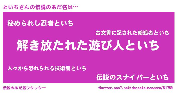 | 男性向けラノベタイトル風あだ名 | 『魔弾の王とといち』 |
