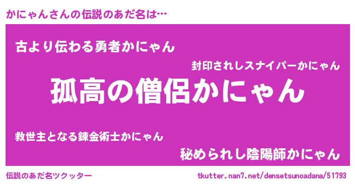 | 男性向けラノベタイトル風あだ名 | 『カニャンスレイヤー』『緋弾のカニャン』 |