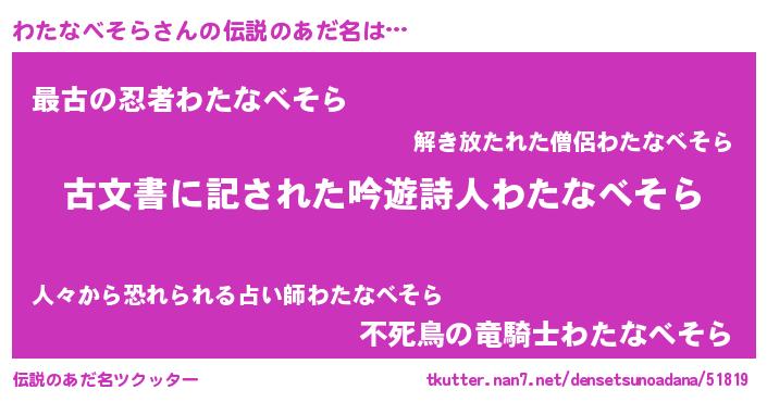 | ヒーロー風カッコイイあだ名 | 『ネオワタナベソラ』『魔戒騎士ワタ』 |