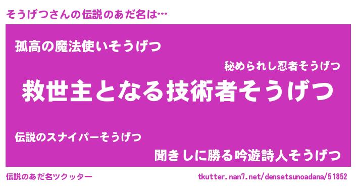 | ヒーロー風カッコイイあだ名 | 『慈愛の使者そうげつ』『黄金騎士ソウ』 |