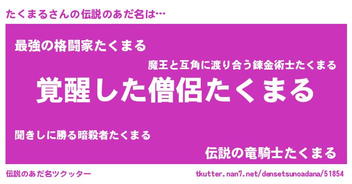 | ヒーロー風カッコイイあだ名 | 『天弓騎士タク』『ウルトラたくまるマン』 |