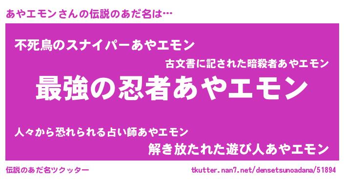 | 男性向けラノベタイトル風あだ名 | 『あやエモンに滅ぼされるだけの簡単なお仕事です』 |
