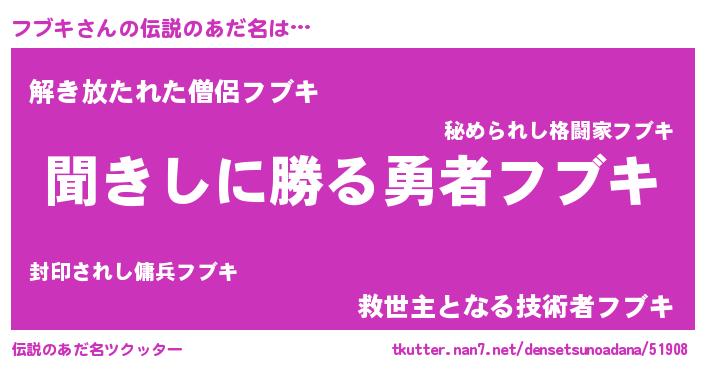 | ヒーロー風カッコイイあだ名 | 『ネオフブキ』『銀牙騎士フブ』 |