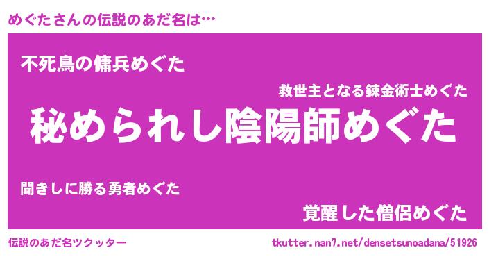 | 女子向けラノベタイトル風あだ名 | 『めぐたの雑貨屋さん』『闇のめぐた』 |