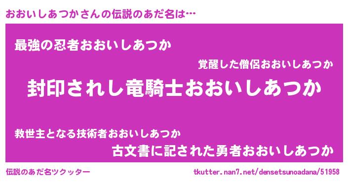| ヒーロー風カッコイイあだ名 | 『最強戦士オオイシアツカ』 |