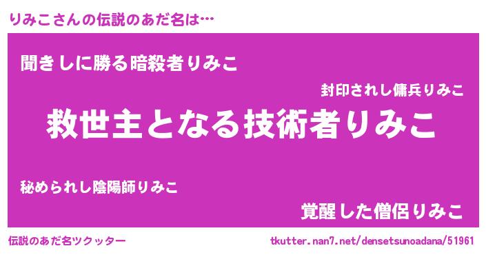 | 男性向けラノベタイトル風あだ名 | 『うちのりみこが世界を掌握している!』 |