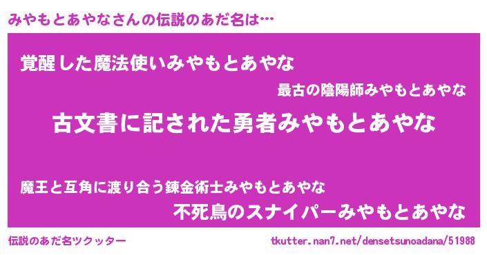 | ヘコむあだ名 | 『みやもとあやな(遠い目)』『みやっちょ』 |
