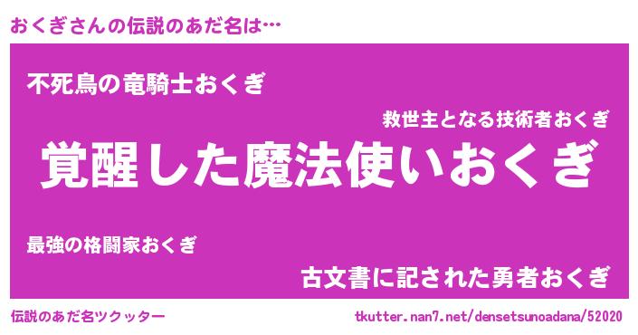 | 胡散臭い通販商品みたいなあだ名 | 『あなたにだけ特別に提供する100年もののヴィンテージワイン…その名も「おくぎ」』 |