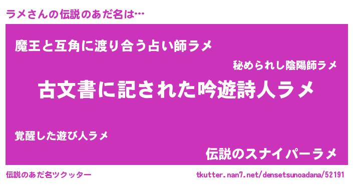| 男性向けラノベタイトル風あだ名 | 『ラメに滅ぼされるだけの簡単なお仕事です』 |
